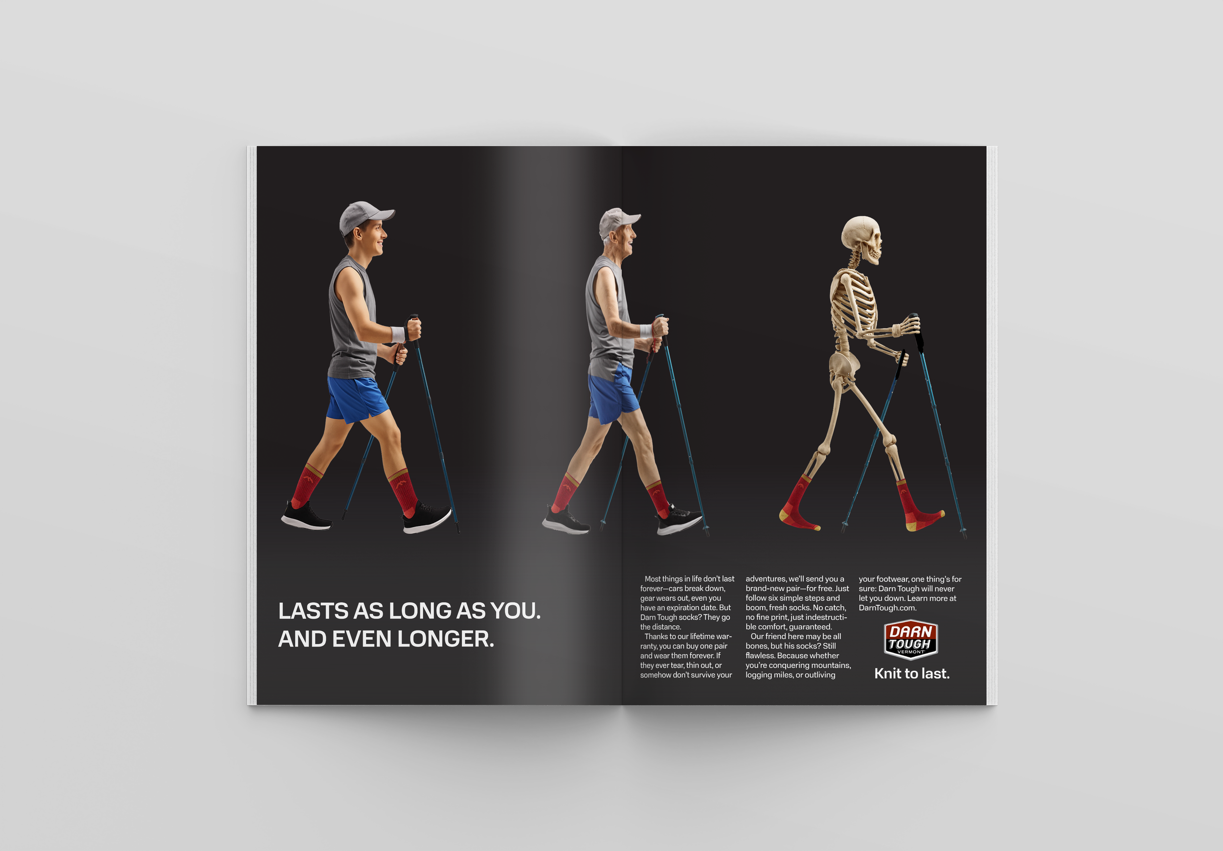 Over time, socks wear down from continuous use and inevitably have to be thrown away. The quality materials in Darn Tough socks means they are guaranteed to last a lifetime. And possibly, even beyond. We are positioning Darn Tough socks as the last pair of socks you'll ever need—literally. We are showcasing the lifetime guarantee by placing the socks on creatures that have lasted beyond the human lifespan.