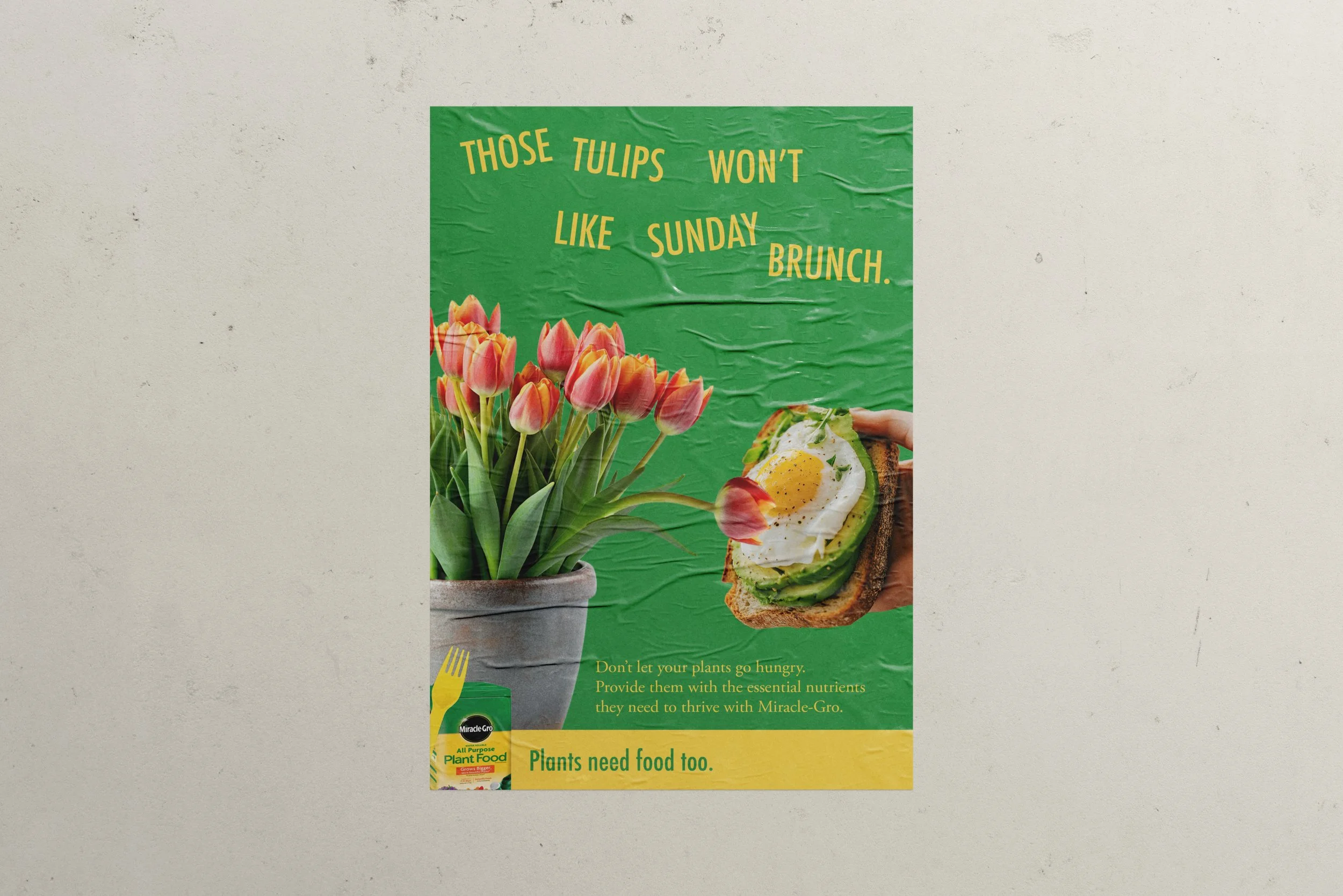 Just like humans, plants need food to survive and get strong. They can’t eat our food but they can eat Miracle-Gro Plant Food. Packed full of nutrients, Miracle-Gro is used for plants to grow strong and healthy. To convey plants having the same quench for hunger as humans, we incorporated visuals of plants attempting to eat various healthy human foods.